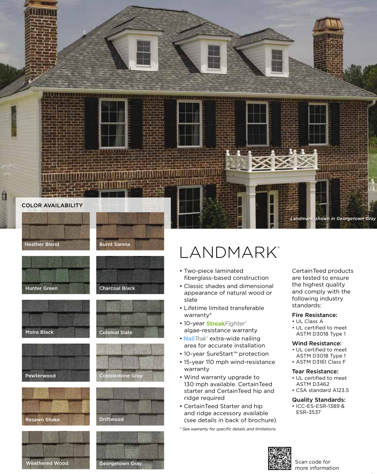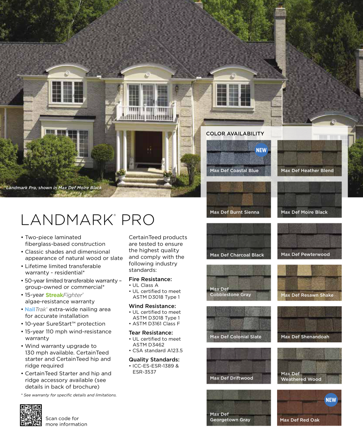 Beyond their strength, Landmark PRO shingles offer superior color depth and visual definition, thanks to CertainTeed's "Max Def" color technology. This creates a dimensional, richly textured look that enhances any architectural style — from classic Colonials to modern ranch homes. Each shingle also includes StreakFighter algae-resistance and a Class A fire rating, ensuring that homeowners receive both aesthetic appeal and top-tier protection. By choosing Landmark PRO as our standard, we're not just selecting a shingle — we're choosing a product that meets our standards for craftsmanship, warranty coverage and long-term homeowner satisfaction.