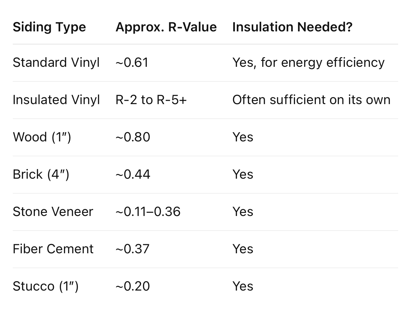 Below are some examples of how r-value compares across common siding types and what it means for homeowners: