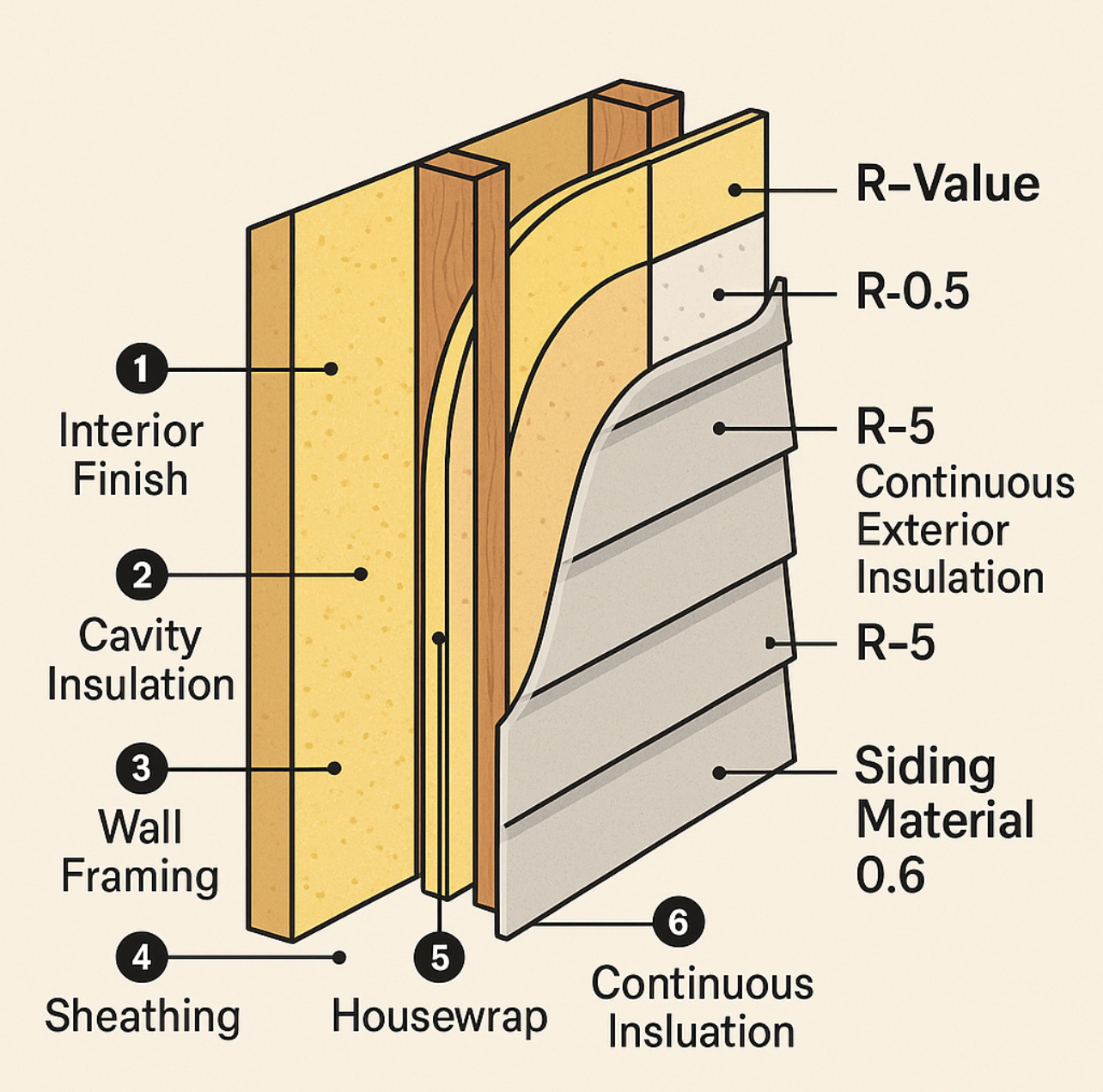 It’s important to understand that R-value for exterior walls isn’t just one material; it’s the combined effect of everything that makes up the wall assembly. Every layer of your exterior wall - siding, insulation, sheathing and even drywall - has it’s own R-value and contributes to the overall R-value of your home. Here’s what’s typically included when calculating it: