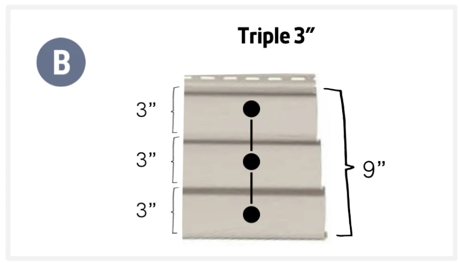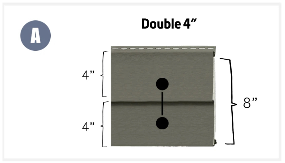For example, double 4" vinyl siding (often marketed as D4) refers to horizontal vinyl siding that has two 4" wide courses per individual panel of siding (as seen below in figure a). Whereas, triple 3" vinyl siding (often marketed as T3) consists of three 3" wide courses per panel of siding (as seen below in figure b).