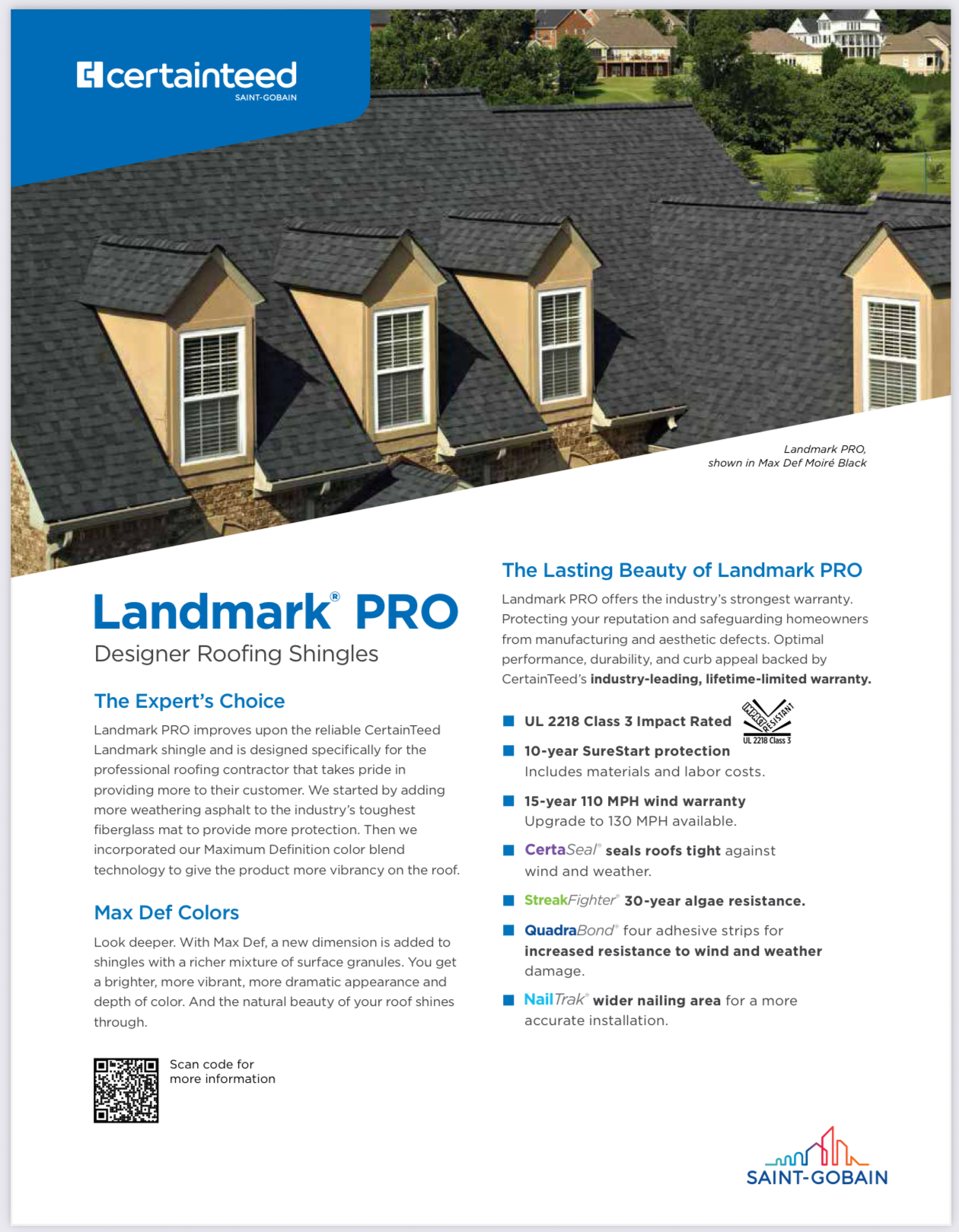 Beyond their strength, Landmark PRO shingles offer superior color depth and visual definition, thanks to CertainTeed's "Max Def" color technology. This creates a dimensional, richly textured look that enhances any architectural style — from classic Colonials to modern ranch homes. Each shingle also includes StreakFighter® algae-resistance and a Class A fire rating, ensuring that homeowners receive both aesthetic appeal and top-tier protection. By choosing Landmark PRO as our standard, we're not just selecting a shingle — we're choosing a product that meets our standards for craftsmanship, warranty coverage and long-term homeowner satisfaction.